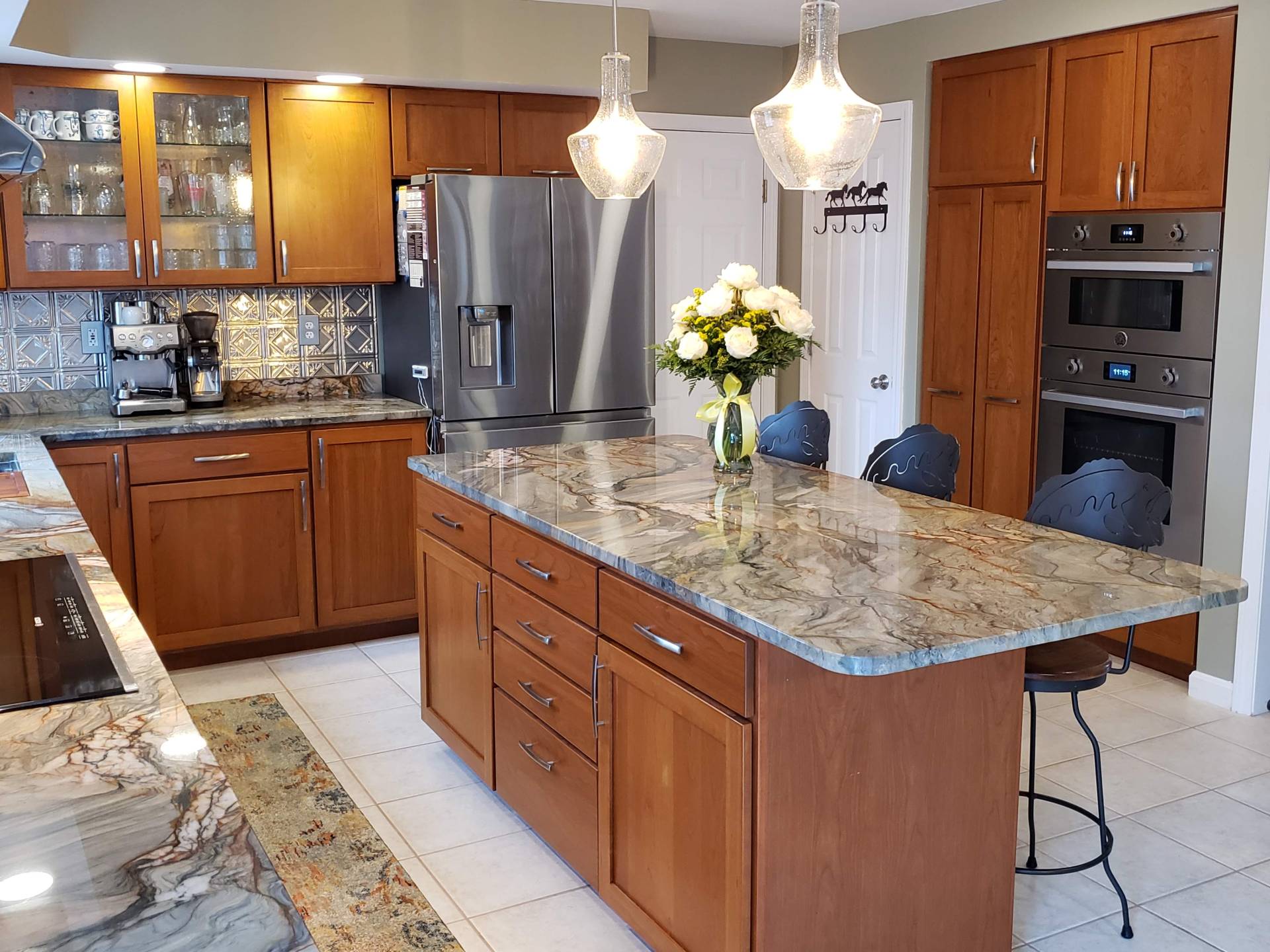 Cabinets overstained and refinished. Costa Smeralda Rose granite island.
